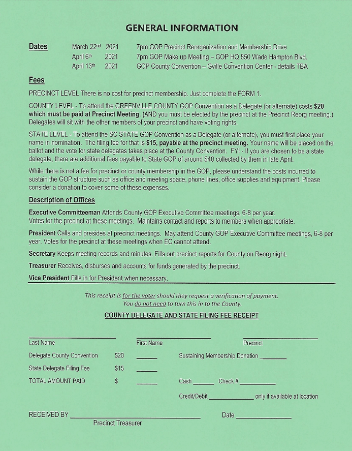 03/12/2021 UPDATE - We received the 2021 Greenville Precinct ReOrg GUIDELINES and SAMPLE FORMS - please get familiar with all of them to know what to expect at the reorg meeting!